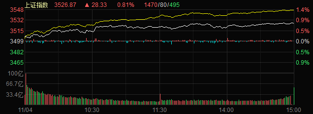 11月4日,A股三大指數(shù)盤(pán)中持續(xù)拉升,集體收漲,深成指表現(xiàn)較強(qiáng)。截至收盤(pán),上證指數(shù)漲0.81%,深證成指漲1.3%,創(chuàng)業(yè)板指漲1.06%;滬深兩市合計(jì)成交額10787.11億元,兩市成交額連續(xù)第10個(gè)交易日突破1萬(wàn)億元;總體來(lái)看,兩市個(gè)股普漲, 3311只個(gè)股上漲。