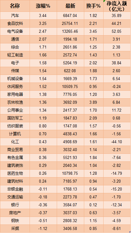 從申萬(wàn)行業(yè)指數(shù)方面來(lái)看,有22類(lèi)行業(yè)上漲,其中,汽車(chē)(3.44%)、食品飲料(3.25%)、電氣設(shè)備(2.47%)、通信(2.07%)等4類(lèi)行業(yè)指數(shù)漲幅均超2%,有6類(lèi)行業(yè)下跌,采掘居前,跌幅達(dá)1.12%。