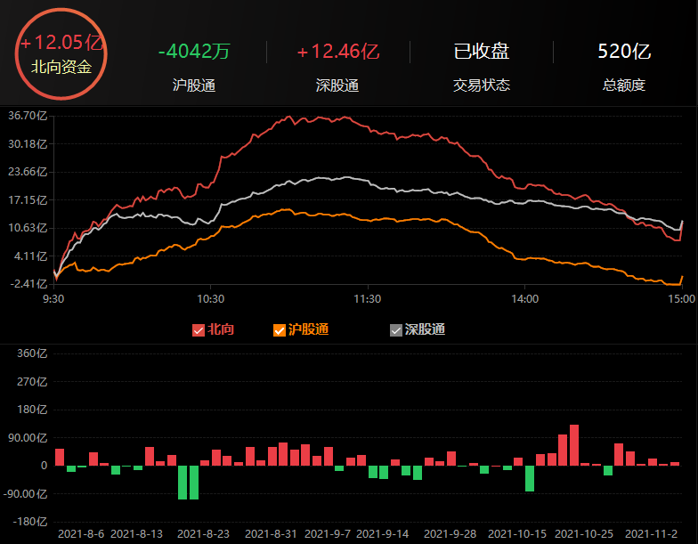 11月3日,北向資金凈買(mǎi)入12.05億元,其中,滬股通凈買(mǎi)入額達(dá)-4042萬(wàn)元,深股通凈買(mǎi)入額達(dá)12.46億元。