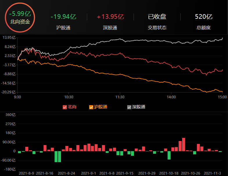 11月5日,北向資金凈買入-5.99億元,其中,滬股通凈買入額達-19.94億元,深股通凈買入額達13.95億元。