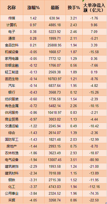 從申萬行業(yè)指數方面來看,僅有5類行業(yè)上漲,分別為:傳媒(1.42%)、計算機(0.97%)、電子(0.38%)、通信(0.28%)、食品飲料(0.21%),另有23類行業(yè)下跌,采掘居首,跌幅達4.05%。
