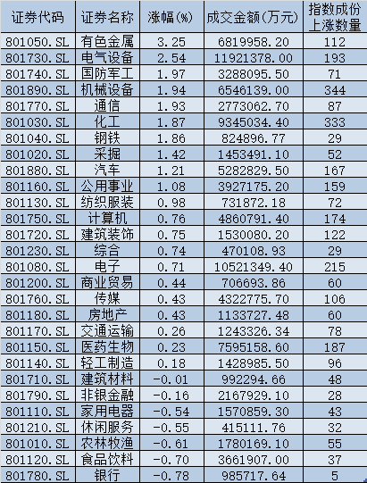 從申萬一級行業(yè)來看,有21個行業(yè)實現(xiàn)上漲,其中,有色金屬、電氣設(shè)備等行業(yè)漲幅居前均超2%,漲幅分別為3.25%、2.54%;另外,銀行、食品飲料、農(nóng)林牧漁等行業(yè)則震蕩走低。