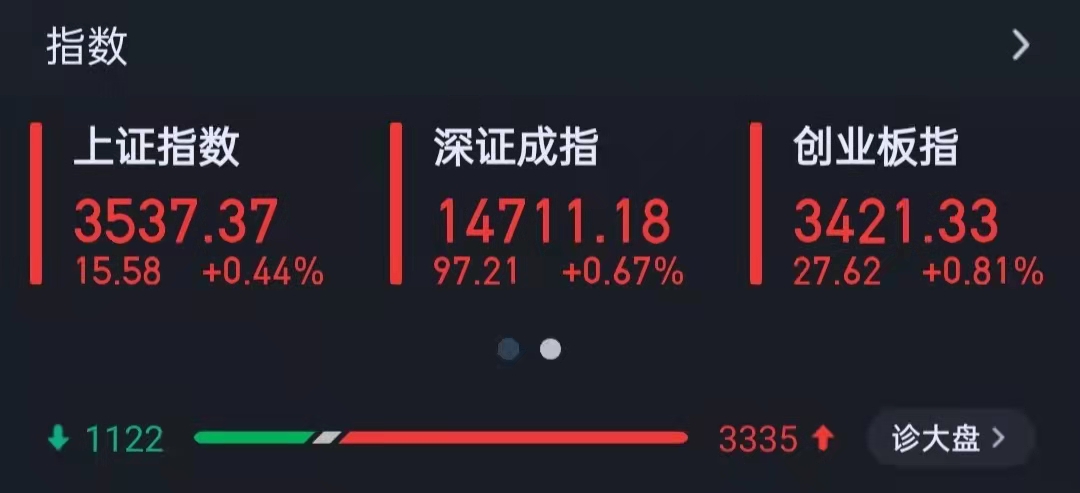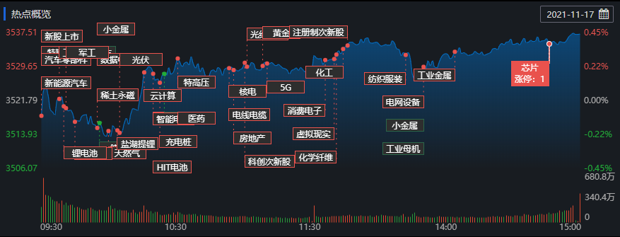 11月17日,A股三大指數(shù)集體上漲,截至收盤,上證指數(shù)漲0.44%,報3537.37點;深證成指漲0.67%,報14711.18點;創(chuàng)業(yè)板指漲0.81%,報3421.33點;滬深兩市合計成交額10371.76億元,連續(xù)第19個交易日突破1萬億元;總體來看,兩市個股普漲。