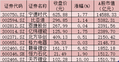 表:截至11月17日收盤總市值在1500億元以上的鋰電池概念股