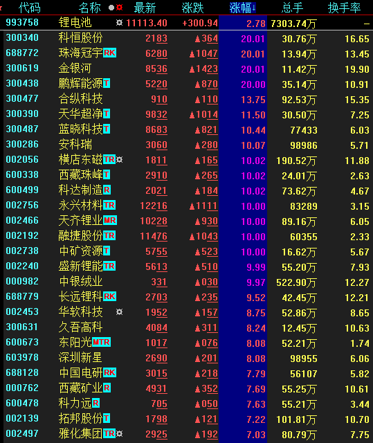 鋰電池概念今日盤中走勢強勁,截至收盤,科恒股份、金銀河、鵬輝能源等個股“20cm”漲停,橫店東磁、西藏珠峰、永興材料、融捷股份、天齊鋰業(yè)等個股也紛紛漲停。