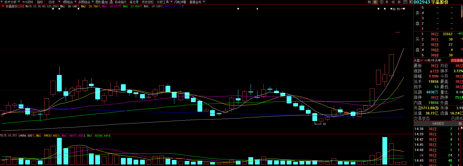 值得注意的是,宇晶股份在最近的6個交易日已斬獲5個漲停板。