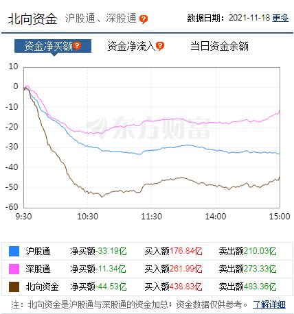 北向資金延續(xù)凈流出態(tài)勢(shì),11月18日,北向資金凈賣(mài)出44.53億元,其中,滬股通凈賣(mài)出33.19億元,深股通凈買(mǎi)入11.34億元。