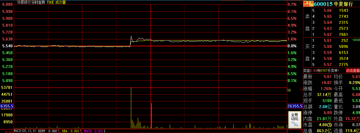 截至收盤(pán),華夏銀行報(bào)價(jià)5.61元,漲幅1.26%。