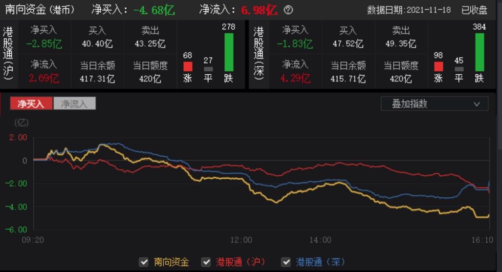 隨著指數(shù)跌幅逐漸加大,南向資金也持續(xù)流出,全天凈賣出4.68億港元。