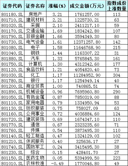 從申萬(wàn)一級(jí)行業(yè)來(lái)看,周五僅農(nóng)林牧漁行業(yè)指數(shù)微跌0.49%,其他行業(yè)指數(shù)均呈現(xiàn)不同程度的上漲,其中,房地產(chǎn)行業(yè)領(lǐng)漲,漲幅達(dá)到3.21%,建筑材料和采掘等行業(yè)漲幅也均在2%以上。