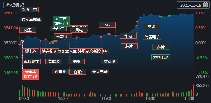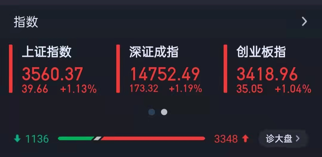 11月19日,A股三大指數(shù)持續(xù)拉升,集體漲超1%。截至收盤(pán),上證指數(shù)漲1.13%,報(bào)3560.37點(diǎn);深證成指漲1.19%,報(bào)14752.49點(diǎn);創(chuàng)業(yè)板指漲1.04%,報(bào)3410.96點(diǎn);滬深兩市合計(jì)成交額11131.51億元,連續(xù)第21個(gè)交易日突破1萬(wàn)億元。