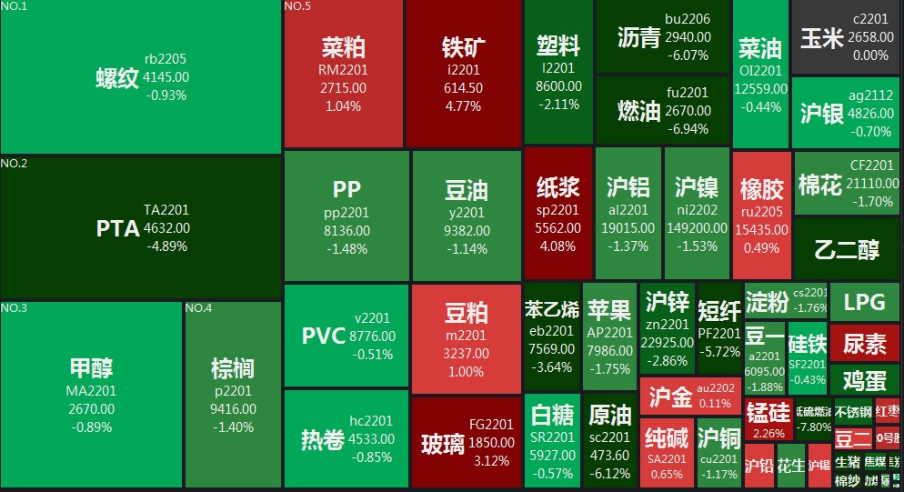 11月29日,國(guó)內(nèi)期市盤收盤多數(shù)品種收跌。鐵礦石、紙漿主力收漲超4%,玻璃、錳硅、尿素、紅棗、20號(hào)膠、菜粕、豆粕等主力漲幅在1%至3.12%不等。低硫燃油、燃油主力盤中一度跌停,分別收跌7.80%、6.94%。動(dòng)力煤、原油、瀝青、短纖、PTA、乙二醇、焦炭、生豬等主力均跌超4%。
