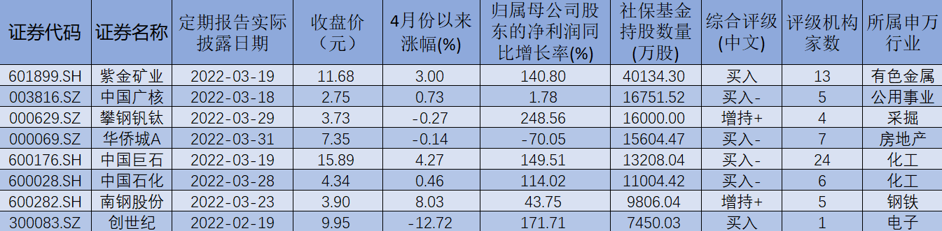 表:4月份以來(lái)截至4月11日,在社?;鹦逻M(jìn)增持股中,持股總數(shù)超5000萬(wàn)股個(gè)股市場(chǎng)表現(xiàn)一覽