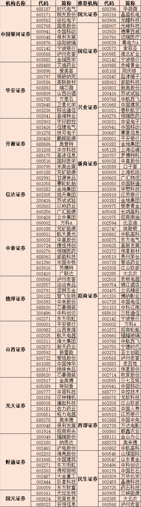 從券商推薦的個股來看,上述151只金股中,有20只個股獲2家及以上券商推薦。其中,寧波銀行、中國移動、瀘州老窖、金地集團等4只個股均獲3家券商聯(lián)合推薦。