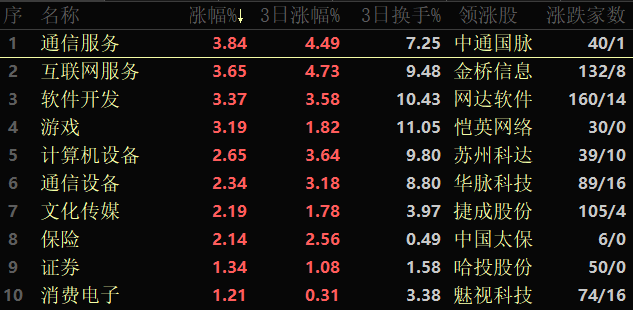 東方財(cái)富行業(yè)方面,截至3月1日11:30,86類行業(yè)中62類上漲,占比72.09%,其中,通信服務(wù)行業(yè)漲幅居首,達(dá)3.84%,此外,互聯(lián)網(wǎng)服務(wù)、軟件開發(fā)和游戲等行業(yè)漲幅也均超3%。下跌方面,光伏設(shè)備跌幅居首,達(dá)1.72%。