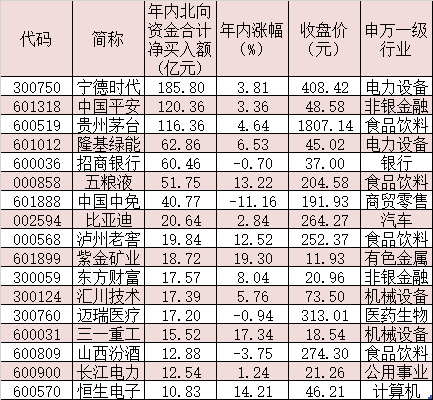 具體來看,寧德時代、中國平安、貴州茅臺等3只個股年內(nèi)累計北向資金凈買入額均超百億元,分別達(dá)到185.80億元、120.36億元和116.36億元,隆基綠能、招商銀行、五糧液、中國中免、比亞迪等5只個股年內(nèi)均受到20億元以上北向資金布局。