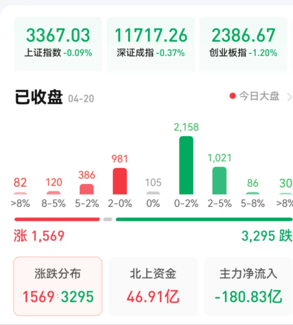 周四(4月20日),A股三大股指繼續(xù)震蕩整理。截至收盤,上證指數(shù)跌0.09%報(bào)3367.03點(diǎn),深證成指跌0.37%報(bào)11717.26點(diǎn),創(chuàng)業(yè)板指跌1.20%報(bào)2386.67點(diǎn),滬深兩市合計(jì)成交額11386.85億元,連續(xù)第13個(gè)交易日突破萬(wàn)億元,北向資金凈買入46.91億元??傮w上看,兩市個(gè)股跌多漲少。其中,漲停個(gè)股達(dá)36只,跌停個(gè)股達(dá)25只。