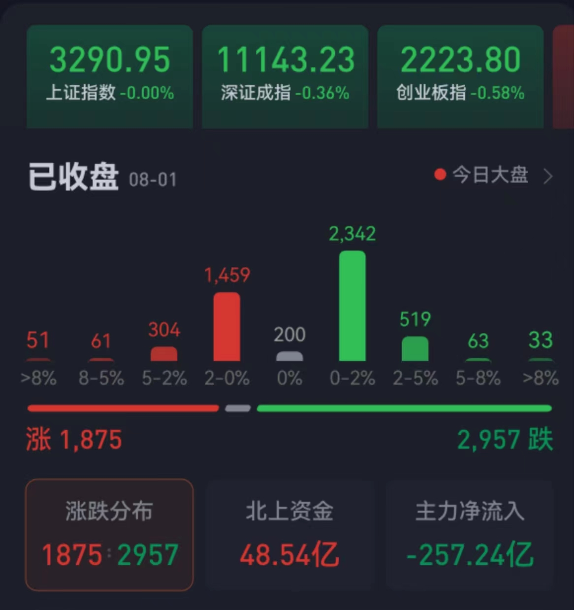 周二(8月1日),A股三大股指震蕩整理,略有回落。截至收盤,上證指數(shù)微跌0.09點報3290.95點,深證成指跌0.36%報11143.23點,創(chuàng)業(yè)板指跌0.58%報2223.8點,兩市合計成交金額達(dá)9566.78億元。北向資金凈買入48.54億元,連續(xù)6日凈買入,其中,滬股通凈買入48.18億元,深股通凈買入0.36億元??傮w上看,兩市個股跌多漲少。其中,漲停個股達(dá)39只,跌停個股達(dá)3只。