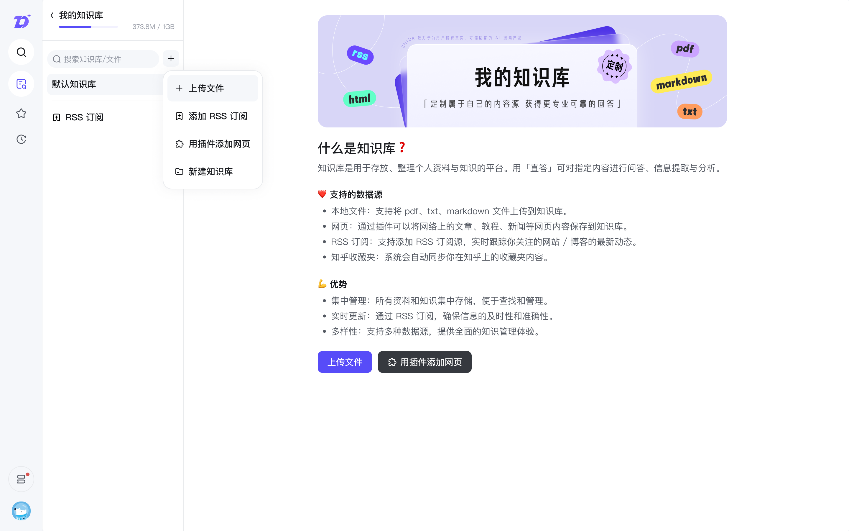此外,知乎直答還同步上線知識庫功能,集合了本地文件上傳、網頁收藏、RSS訂閱、知乎收藏夾等模塊,用戶可使用DeepSeek-R1模型對論文、文檔、網頁、知乎問答等特有內容進行信息提取、分析和分享,便于構建和管理屬于用戶的個人知識庫。