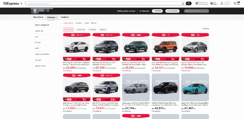 速賣通店鋪頁面顯示,目前上架的車輛以中國品牌為主,新能源車型占比較多,包括比亞迪元、吉利星愿、小米SU7、理想L7、小鵬G9等。其中不少都已加入速賣通“百億補(bǔ)貼”品牌出海。 圖:速賣通賣車頁面