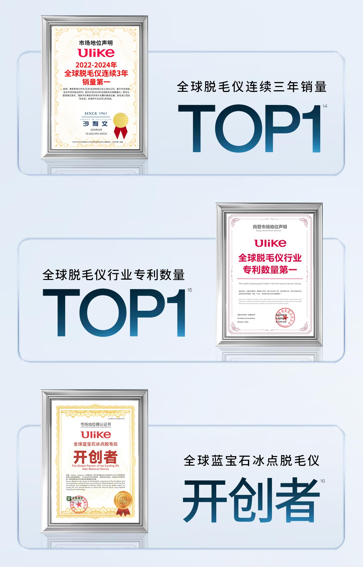Ulike不僅在中國(guó)連續(xù)10年618銷(xiāo)售行業(yè)領(lǐng)先,更是被認(rèn)證為“全球銷(xiāo)售第一的脫毛儀”。根據(jù)弗若斯特沙利文(Frost&Sullivan)調(diào)研數(shù)據(jù),在2016年-2024年度中國(guó)脫毛儀市場(chǎng)中,Ulike連續(xù)9年銷(xiāo)售Top1;在2022年-2024年度全球脫毛儀市場(chǎng)中,Ulike連續(xù)3年銷(xiāo)量Top1。