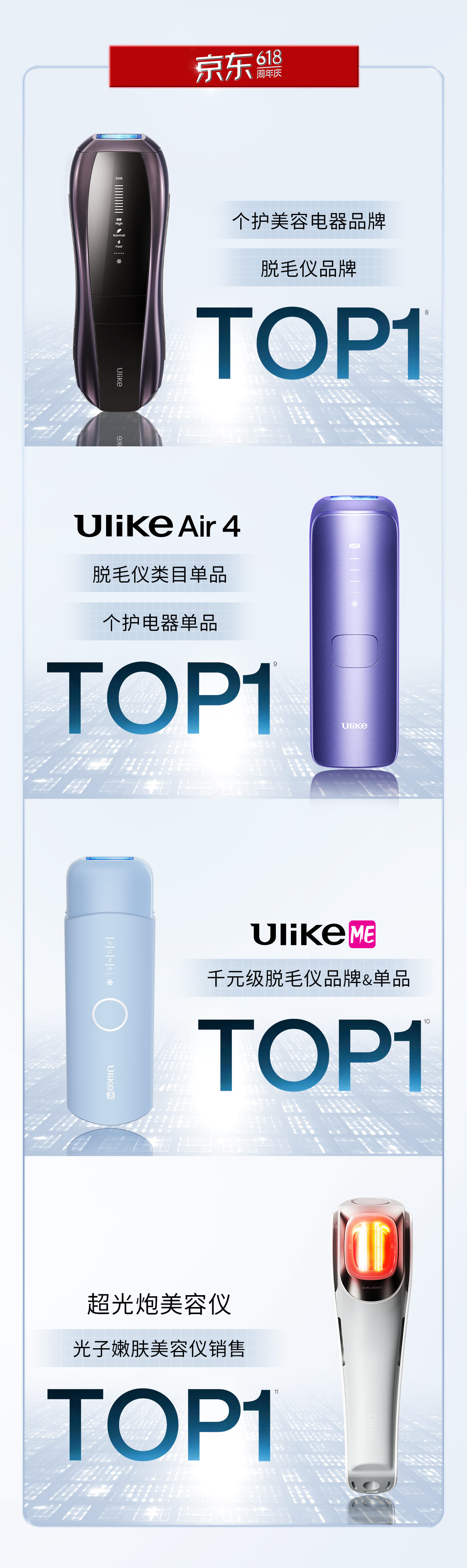 Ulike斬獲京東平臺(tái)“個(gè)護(hù)美容電器品牌”“脫毛儀品牌”“脫毛儀類(lèi)目單品”“個(gè)護(hù)電器單品”“千元級(jí)脫毛儀品牌&單品”等多個(gè)榜單榜首;Ulike超光炮美容儀獲得“光子嫩膚美容儀”銷(xiāo)售Top1。