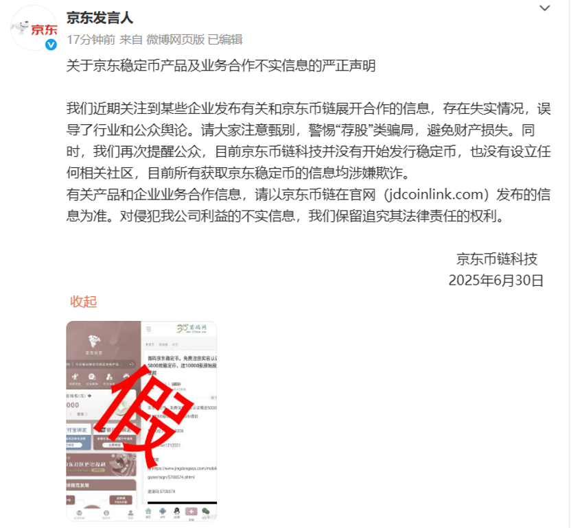 對此,“京東發(fā)言人”官方微博6月30日發(fā)文表示:“我們近期關(guān)注到某些企業(yè)發(fā)布有關(guān)和京東幣鏈展開合作的信息,存在失實情況,誤導(dǎo)了行業(yè)和公眾輿論。目前京東幣鏈科技并沒有開始發(fā)行穩(wěn)定幣,也沒有設(shè)立任何相關(guān)社區(qū),目前所有獲取京東穩(wěn)定幣的信息均涉嫌欺詐。”