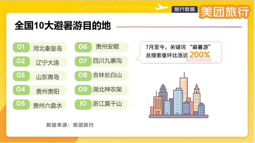 據(jù)美團(tuán)旅行數(shù)據(jù),今年夏天,Top10熱門(mén)避暑目的地分別為:河北秦皇島、遼寧大連、山東青島、貴州貴陽(yáng)、貴州六盤(pán)水、貴州安順、四川九寨溝、吉林長(zhǎng)白山、湖北神農(nóng)架、浙江莫干山,熱門(mén)避暑清涼景區(qū)有清遠(yuǎn)古龍峽、青海湖二郎劍景區(qū)、霍山大峽谷漂流、婺女洲度假區(qū)、玉龍雪山國(guó)家風(fēng)景名勝區(qū)、潿洲島等,多個(gè)有漂流體驗(yàn)的景區(qū)都有上榜。
