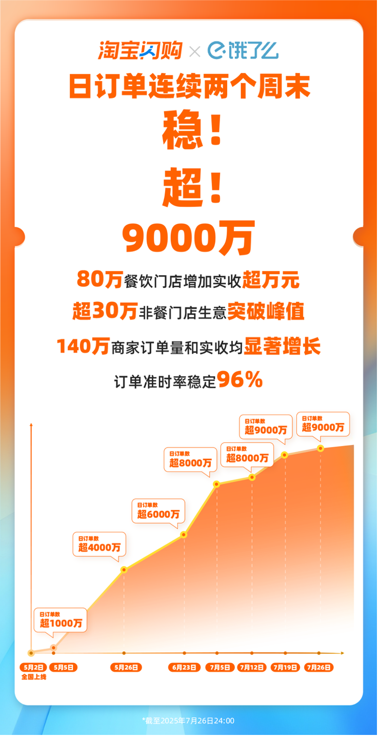 淘寶閃購(gòu)自5月份上線以來(lái),日訂單屢創(chuàng)新高,從1000萬(wàn)單、4000萬(wàn)單、6000萬(wàn)單到連續(xù)兩周峰值超8000萬(wàn)單,再到連續(xù)兩個(gè)周末的日訂單超9000萬(wàn)單。社會(huì)消費(fèi)熱情被持續(xù)點(diǎn)燃,商家生意持續(xù)增長(zhǎng)、收入顯著提升,新興服務(wù)業(yè)市場(chǎng)蓬勃發(fā)展、已進(jìn)入多平臺(tái)良性競(jìng)爭(zhēng)的新階段。