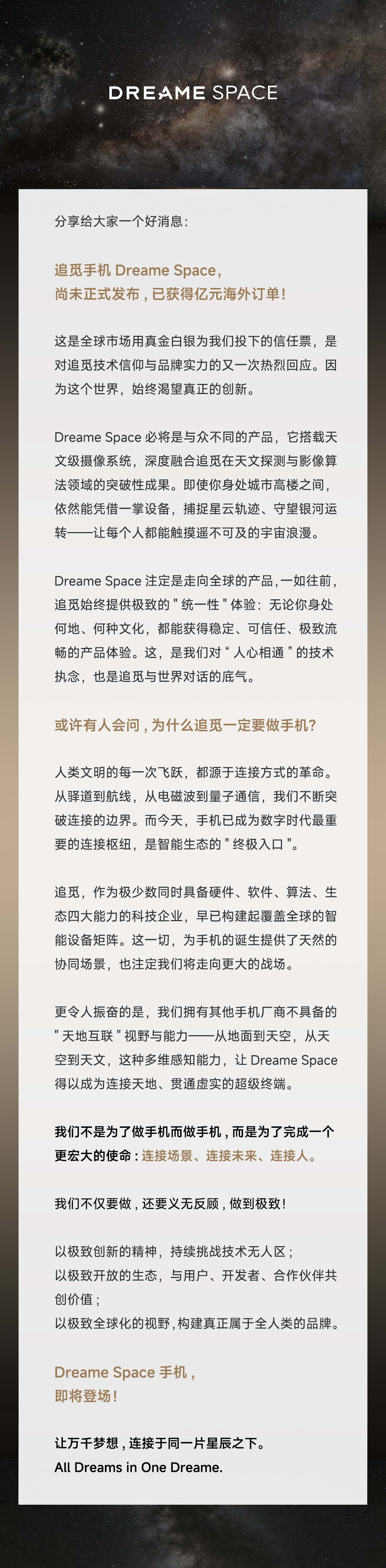 Dreame Space定位高端旗艦,在保障高端綜合體驗的同時還帶來了“天文攝影”這一區(qū)別同類產(chǎn)品的核心賣點,踐行追覓的創(chuàng)新理念,以此試圖重新定義智能旗艦手機的標(biāo)準(zhǔn)。