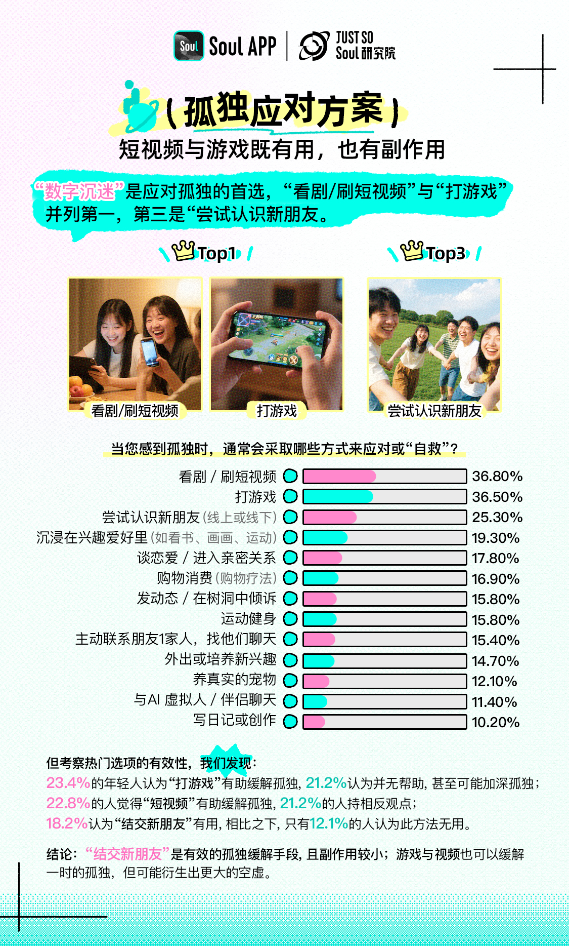 相比之下,有25.3%的年輕人認為“認識新朋友”有助于緩解孤獨,且這種方案的“不滿意率”只有12%(相較游戲與短視頻均超過20%)綜合來看,“結(jié)交好友”是有效手段中副作用最小的,因其能直接針對孤獨的本質(zhì)——高質(zhì)量社交連接的缺失。