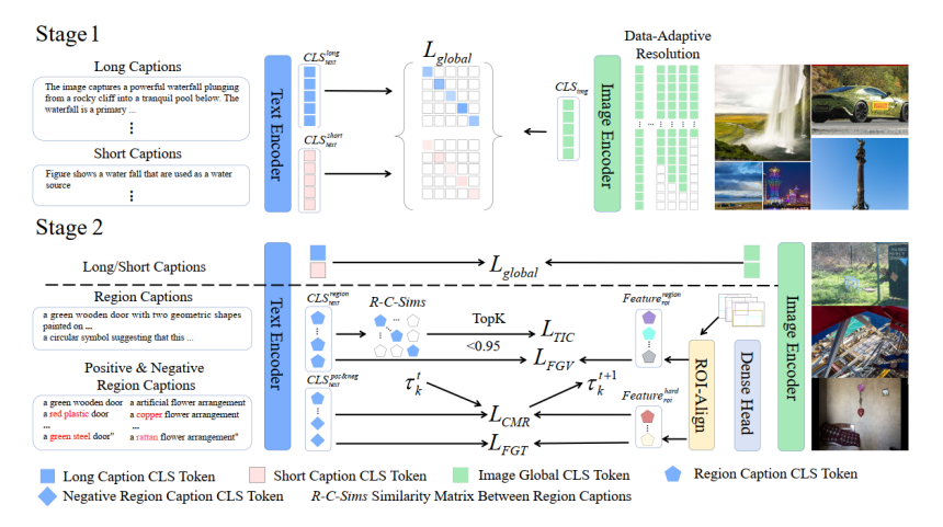 在訓(xùn)練方法上,模型采用了革命性的兩階段策略。其關(guān)鍵的第二階段摒棄了傳統(tǒng)CLIP的“整體對整體”的粗放對齊模式,升級為“局部對局部”的精細(xì)對齊,這正是其實現(xiàn)細(xì)粒度理解的精髓所在。