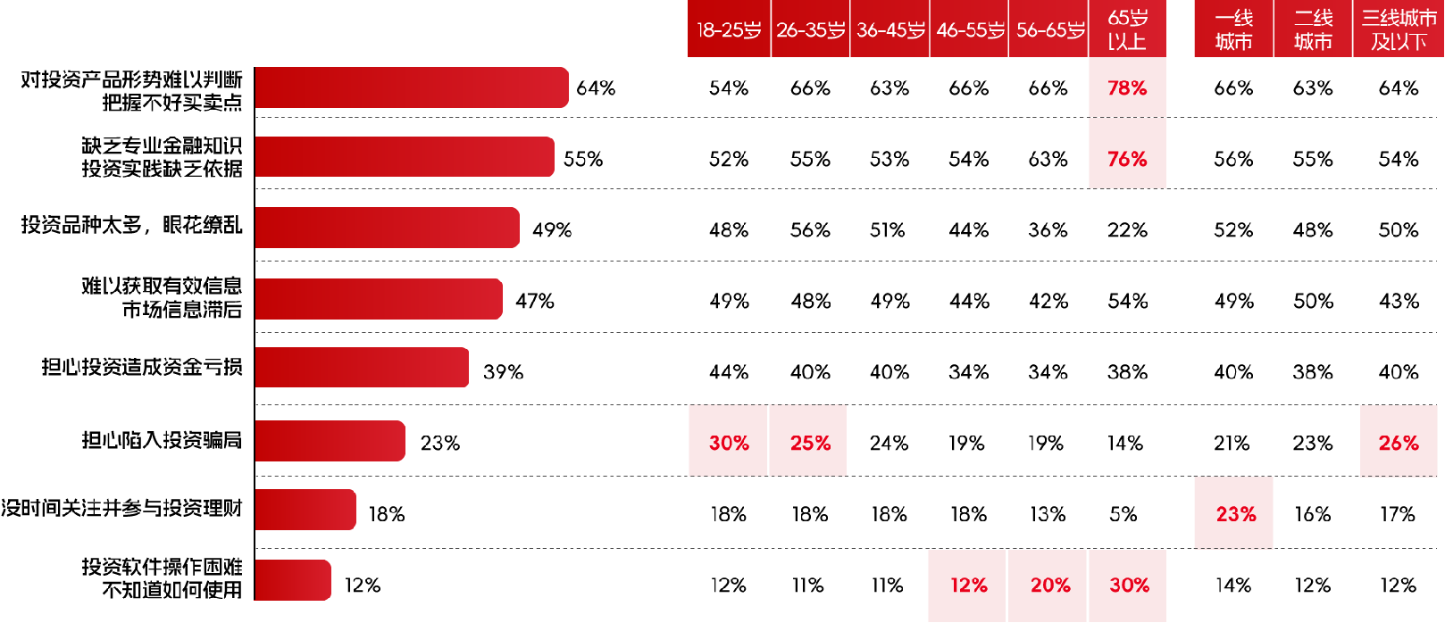 與這些簡單問題形成鮮明對比的,是散戶投資者普遍存在的行為特點。中央財經(jīng)大學(xué)中國財富管理中心的專項調(diào)查提供了詳實的數(shù)據(jù)支撐:64%的投資者表示對投資產(chǎn)品形勢難以判斷,把握不好買賣點;55%的投資者坦言缺乏專業(yè)金融知識,投資實踐缺乏依據(jù);49%的投資者面對琳瑯滿目的投資品種感到眼花繚亂;47%的投資者苦于難以獲取有效信息,市場信息滯后;還有39%的投資者始終擔(dān)憂投資造成資金虧損。