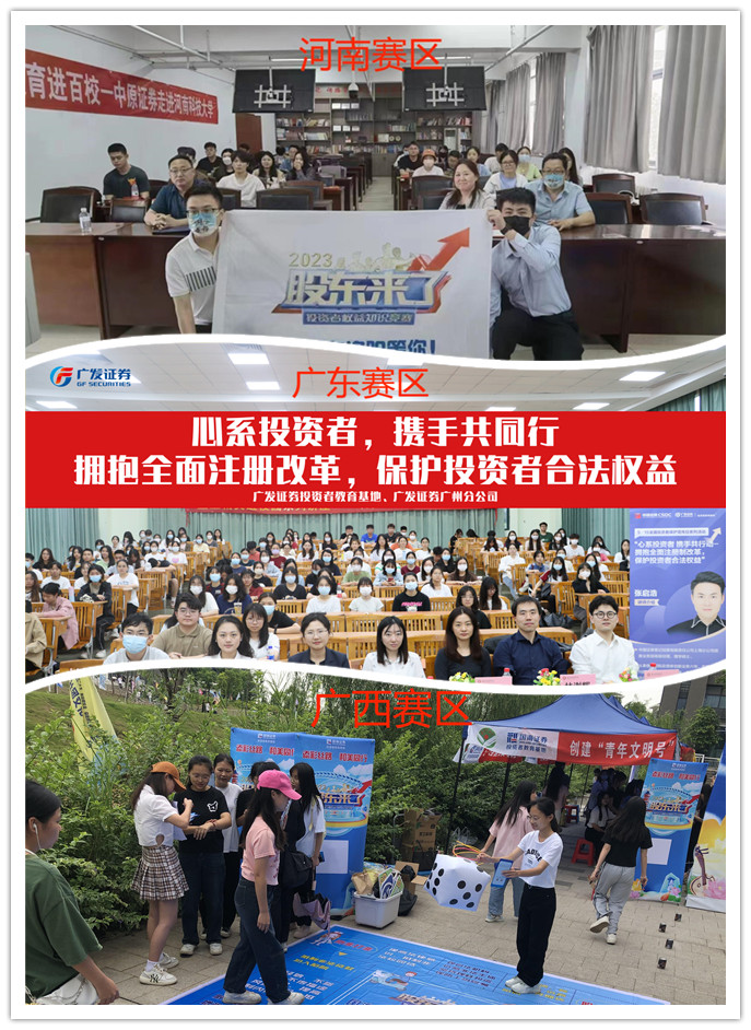 甘肅賽區(qū)走進(jìn)蘭州大學(xué)、蘭州財(cái)經(jīng)大學(xué)等8所高校,宣推賽事同時(shí)普及金融及防詐知識(shí),加強(qiáng)互動(dòng),以寓教于樂的方式吸引更多學(xué)生注冊(cè)答題;福建賽區(qū)走進(jìn)泉州經(jīng)貿(mào)學(xué)院,普及金融知識(shí)的同時(shí)開展競賽宣傳,并通過線上渠道面向閩江學(xué)院、福建江夏學(xué)院、閩西職業(yè)技術(shù)學(xué)院開展賽事宣講;山東賽區(qū)走進(jìn)山東工商學(xué)院、山東理工大學(xué)、煙臺(tái)科技學(xué)院等高校8家,覆蓋近千人,現(xiàn)場介紹參賽規(guī)則、特色板塊、掃碼注冊(cè)、參賽流程等內(nèi)容,講解全面注冊(cè)制與投資者保護(hù)等內(nèi)容;河南賽區(qū)走進(jìn)河南科技大學(xué)商學(xué)院,面向高校學(xué)生普及資本市場知識(shí),宣講活動(dòng)規(guī)則,并組織學(xué)生注冊(cè)參與活動(dòng);廣東賽區(qū)充分發(fā)揮經(jīng)濟(jì)排頭兵、教育資源豐富的優(yōu)勢,走進(jìn)廣州大學(xué)、暨南大學(xué)、廣東財(cái)經(jīng)大學(xué)等高校37所,覆蓋5000余人;廣西賽區(qū)走進(jìn)廣西金融職業(yè)技術(shù)學(xué)院、廣西經(jīng)貿(mào)職業(yè)技術(shù)學(xué)院、南寧職業(yè)技術(shù)學(xué)院等3家高校開展賽事宣傳活動(dòng),利用益智游戲激發(fā)學(xué)生答題興趣;寧夏賽區(qū)相繼走進(jìn)寧夏建設(shè)職業(yè)技術(shù)學(xué)院、寧夏財(cái)經(jīng)職業(yè)技術(shù)學(xué)院、北方民族大學(xué)等多所高校,開展系列活動(dòng)9場,吸引1600余名高校師生的熱情參與;廈門賽區(qū)機(jī)構(gòu)3次走進(jìn)廈門理工學(xué)院,借助招聘會(huì)向理工學(xué)院學(xué)生發(fā)送活動(dòng)宣傳單,積極推進(jìn)學(xué)生參加股東來了答題活動(dòng);青島賽區(qū)共舉辦5場推廣活動(dòng),通過發(fā)放宣傳手冊(cè)、張貼宣傳海報(bào)等方式,系統(tǒng)講解投資者權(quán)利與義務(wù)等內(nèi)容,并與師生互動(dòng)交流。