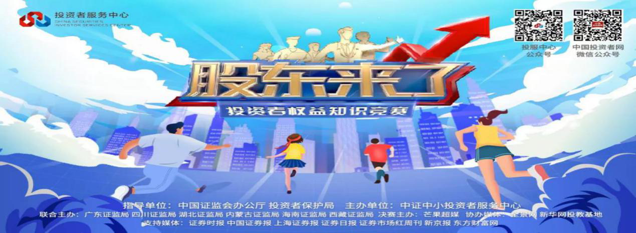 《股東來(lái)了》2021投資者權(quán)益知識(shí)競(jìng)賽活動(dòng),是由中國(guó)證監(jiān)會(huì)辦公廳、投資者保護(hù)局指導(dǎo),中證中小投資者服務(wù)中心聯(lián)合廣東、四川、湖北、內(nèi)蒙古、海南、西藏六證監(jiān)局共同舉辦。本次活動(dòng)面向社會(huì)公眾,以投資者喜聞樂(lè)見(jiàn)的競(jìng)賽形式普及權(quán)益保護(hù)知識(shí),倡導(dǎo)投資者“長(zhǎng)期投資、價(jià)值投資、理性投資”,引導(dǎo)投資者“全面知權(quán)、積極行權(quán)、依法維權(quán)”。具體活動(dòng)流程、游戲規(guī)則請(qǐng)關(guān)注“投服中心”公眾號(hào)、“中國(guó)投資者網(wǎng)”公眾號(hào)、中國(guó)投資者網(wǎng)進(jìn)行查閱。