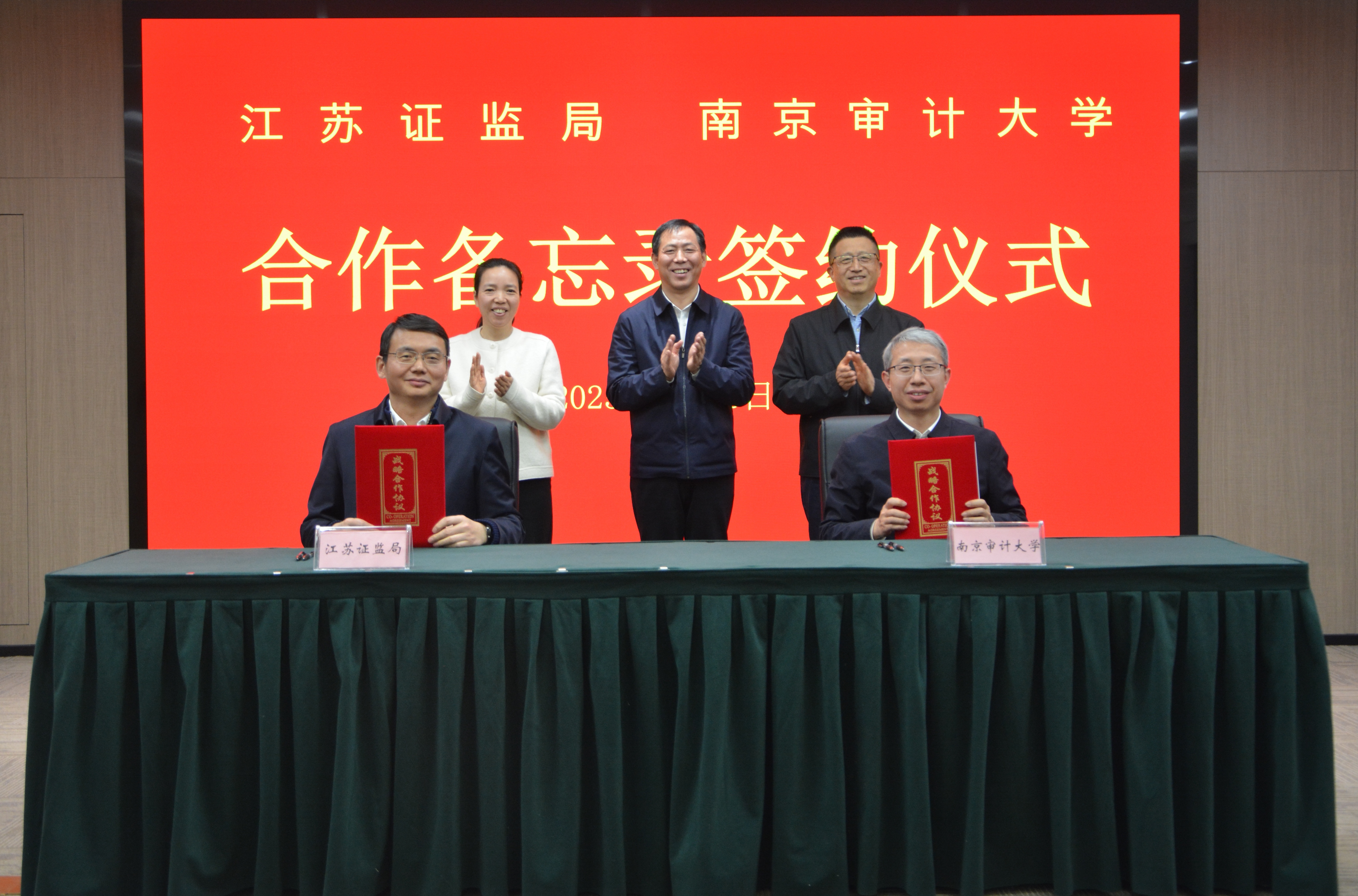 (圖為江蘇證監(jiān)局與南京審計(jì)大學(xué)雙方代表分別簽署合作備忘錄。)