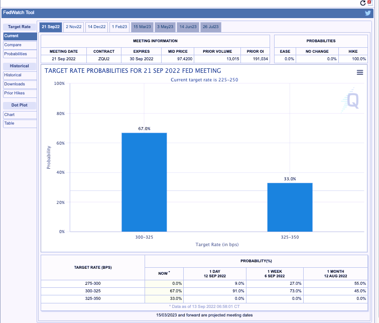 截至北京時(shí)間9月14日早上8點(diǎn),《證券日報(bào)》記者根據(jù)芝商所的FedWatch工具實(shí)時(shí)測算,市場預(yù)測9月份美聯(lián)儲加息75個(gè)基點(diǎn)(從當(dāng)前的2.25%-2.50%利率區(qū)間提高至3.00%-3.25%區(qū)間)的概率為67%,而此前并未出現(xiàn)的預(yù)期選項(xiàng)——大幅加息100個(gè)基點(diǎn)的概率躍升到33%,加息50個(gè)基點(diǎn)的概率則不再存在。