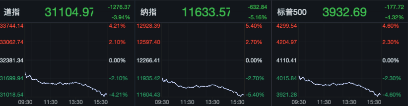 數(shù)據(jù)發(fā)布后,受情緒影響,美元指數(shù)短線快速拉升,再次站上109關(guān)口。美股三大指數(shù)則出現(xiàn)暴跌,創(chuàng)下2020年6月份以來最大單日跌幅。道指跌1276.37點(diǎn),跌幅3.94%;納指跌632.84點(diǎn),跌幅5.16%;標(biāo)普500指數(shù)跌177.72點(diǎn),跌幅4.32%。美債、黃金等資產(chǎn)也出現(xiàn)全線下挫。